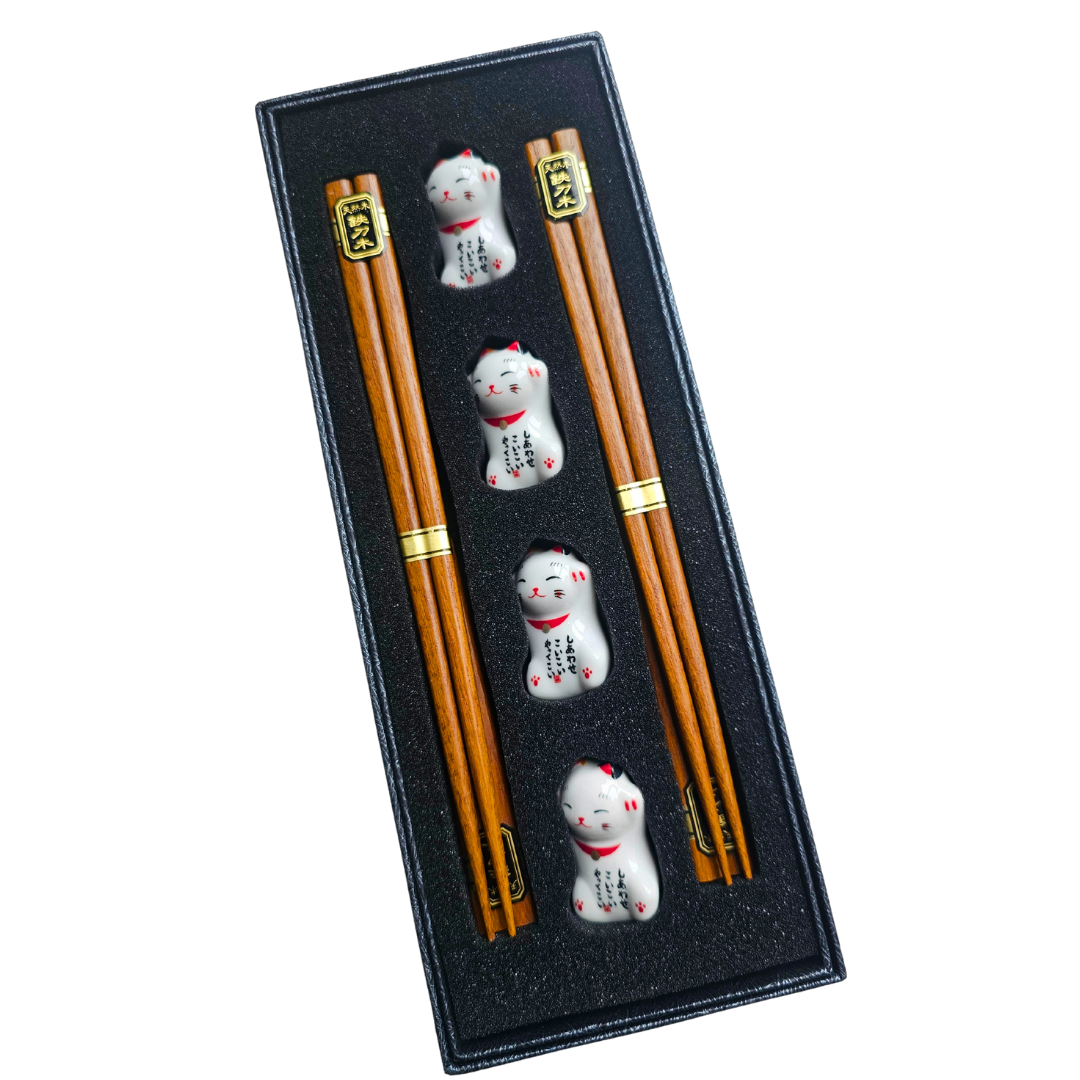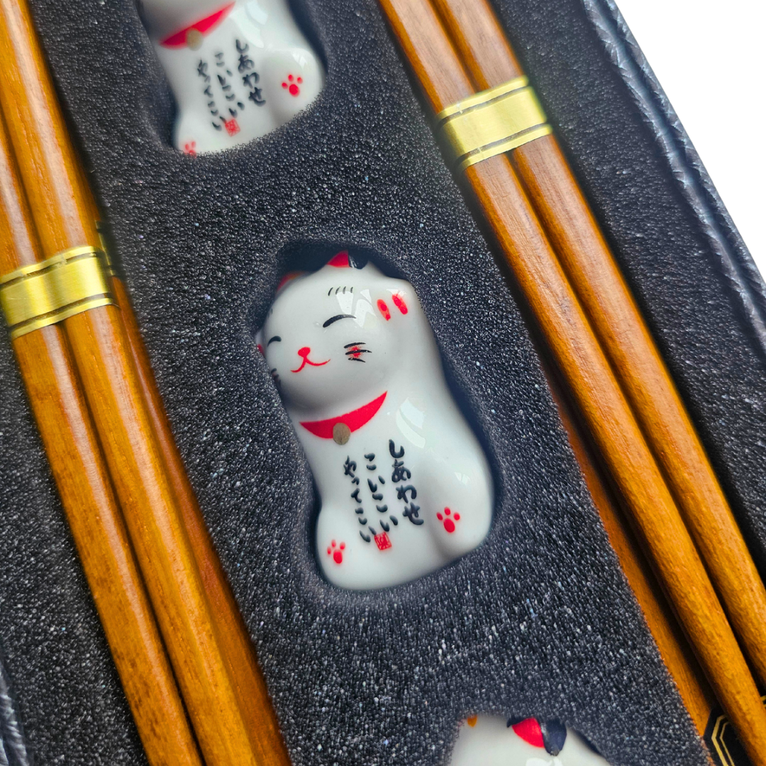 Dazu gehören vier Stäbchenhalter in Form von weißen Winkekatzen (Maneki Neko). Die Halter bestehen aus Keramik und bringen mit ihrem freundlichen Design Glücksflair und verspielte Eleganz auf deinen Esstisch. Gleichzeitig sorgen sie für eine hygienische Ablage deiner Stäbchen.