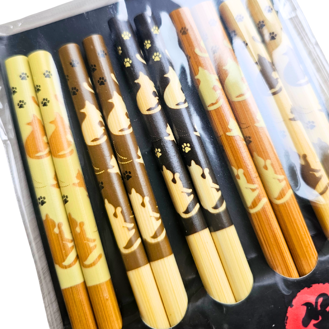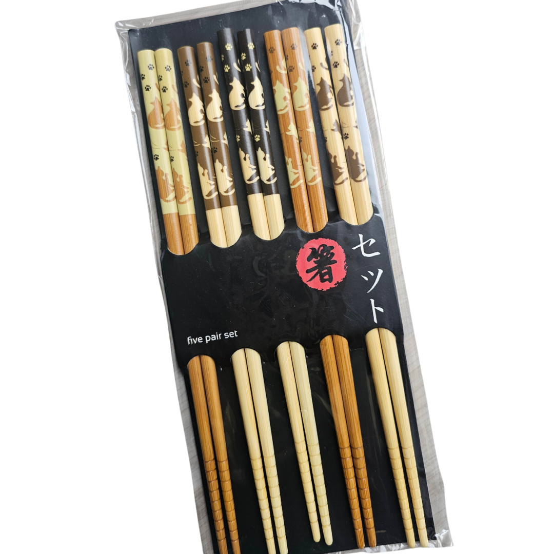 Dieses charmante Stäbchenset bringt warmes, japanisch inspiriertes Design auf deinen Esstisch. Die fünf Paar Stäbchen sind jeweils mit feinen Katzenumrissen in verschiedenen Brauntönen verziert und verleihen jedem Essmoment eine liebevolle, verspielte Note.